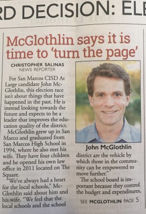 I am excited to run for a three-year term as an at-large trustee on the San Marcos CISD school board. The election is May 9, 2015 with early voting starting on April 27. If we have not had a chance to spend time together yet, I hope this election provides that opportunity. Until then, you can read more about my background and leadership experience in my online bio.